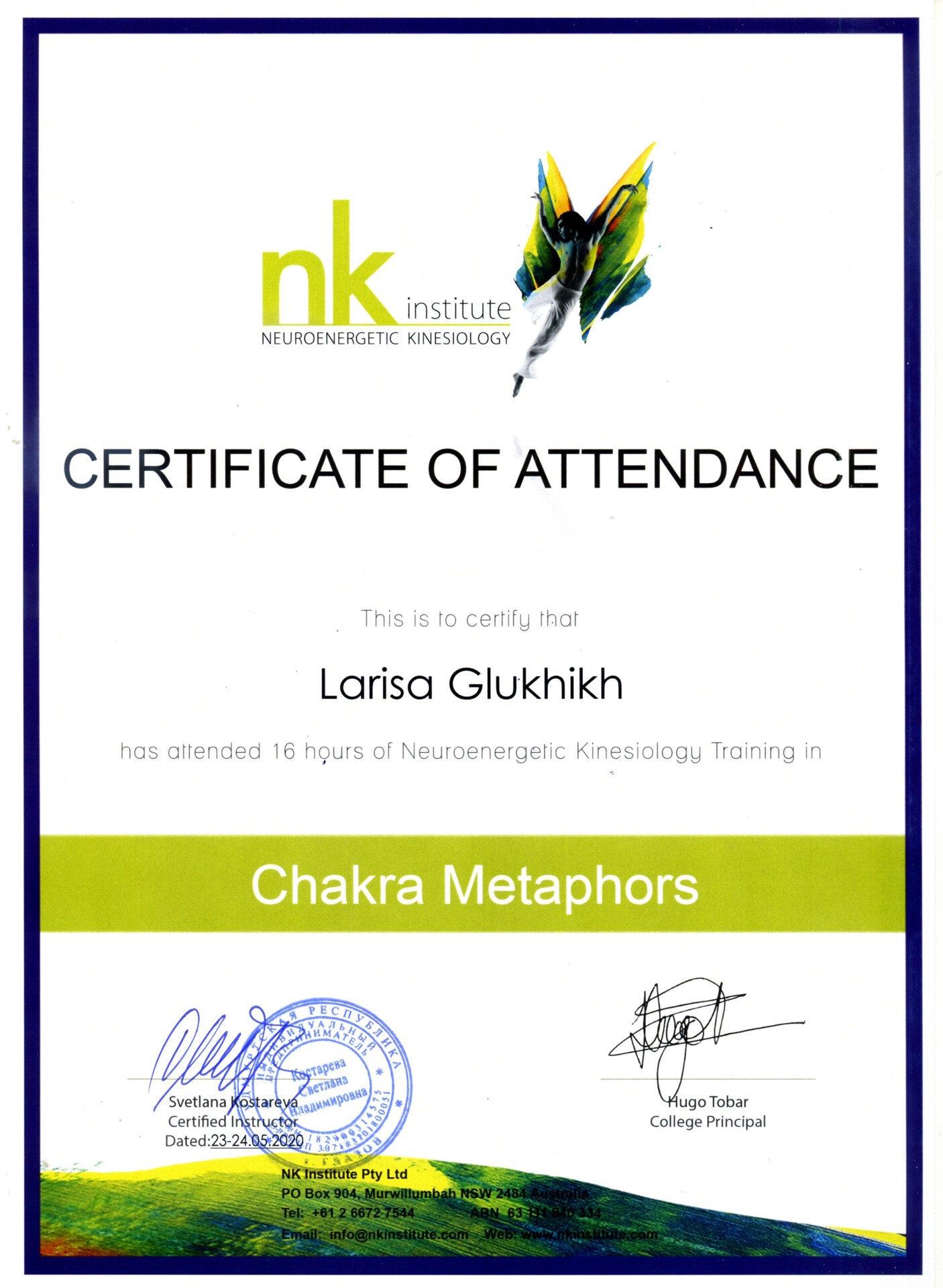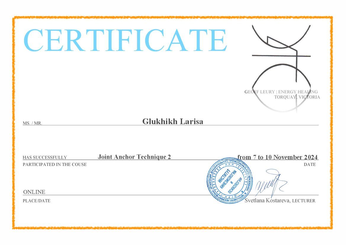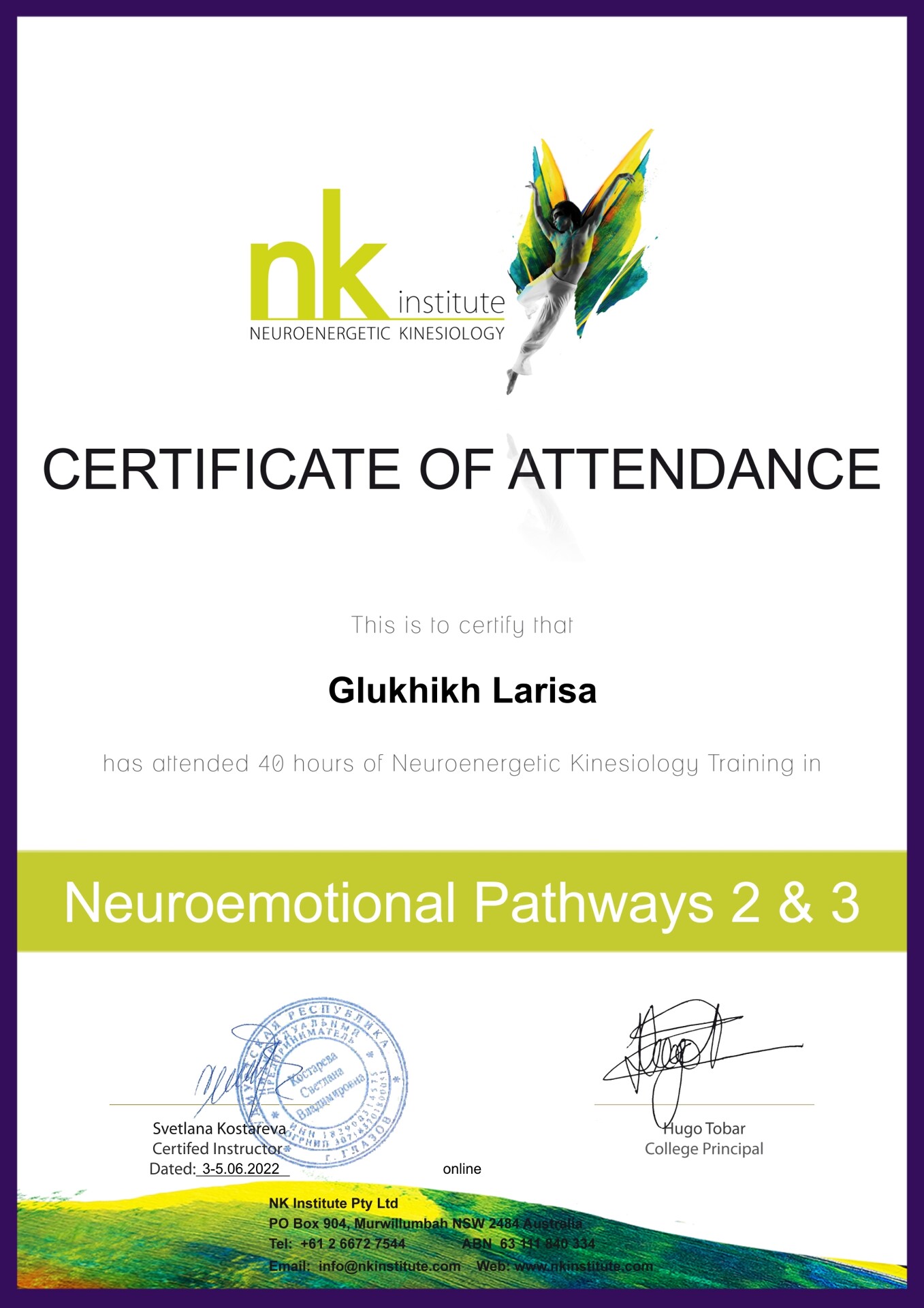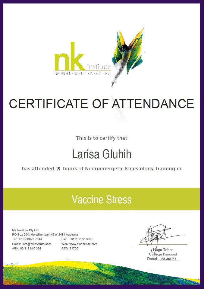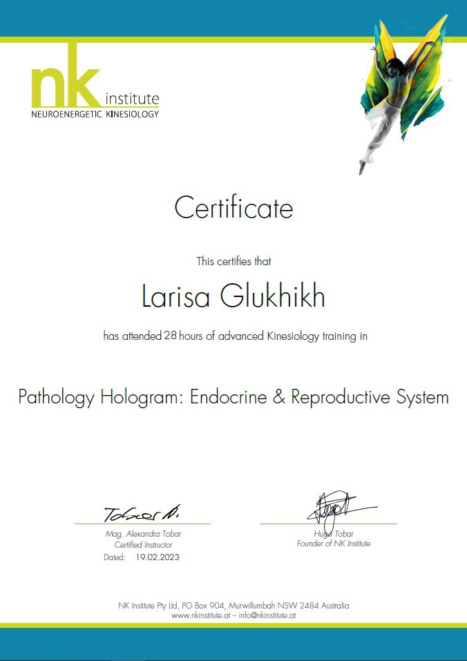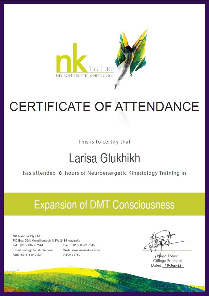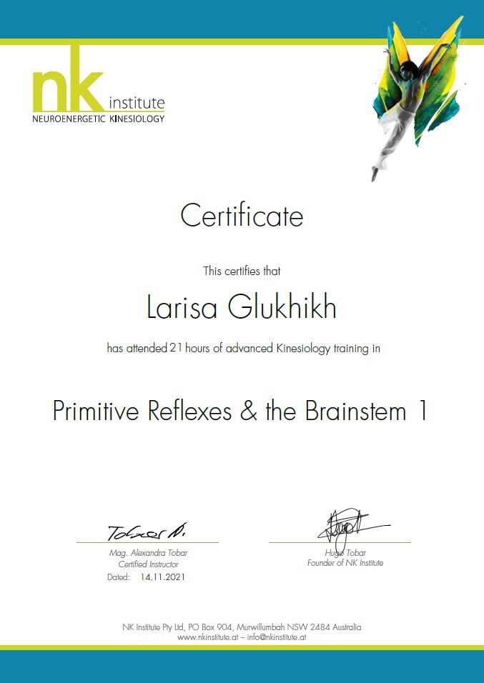 Международный сертифицированный инструктор: Целебного прикосновения 1-4, Гимнастики мозга 101, Гимнастики мозга 104, Резет-1,2, Баланса Энергии, Кругов зрения, Принципы кинезиологии 1-4, Форматирования мозга, Форматирования физиологии, NEPS-1, NEPS-2, NEPS-3, NEPS-4, Голограммы основных чакр, Голограмма чакр 4, Голограмма малых чакр, Голограммы Небесных чакр, Метафоры чакр, Баланс 5 элементов, Техника суставного якоря -1, Техника суставного якоря -2, Автор НейроОбразовательной кинезиологии.