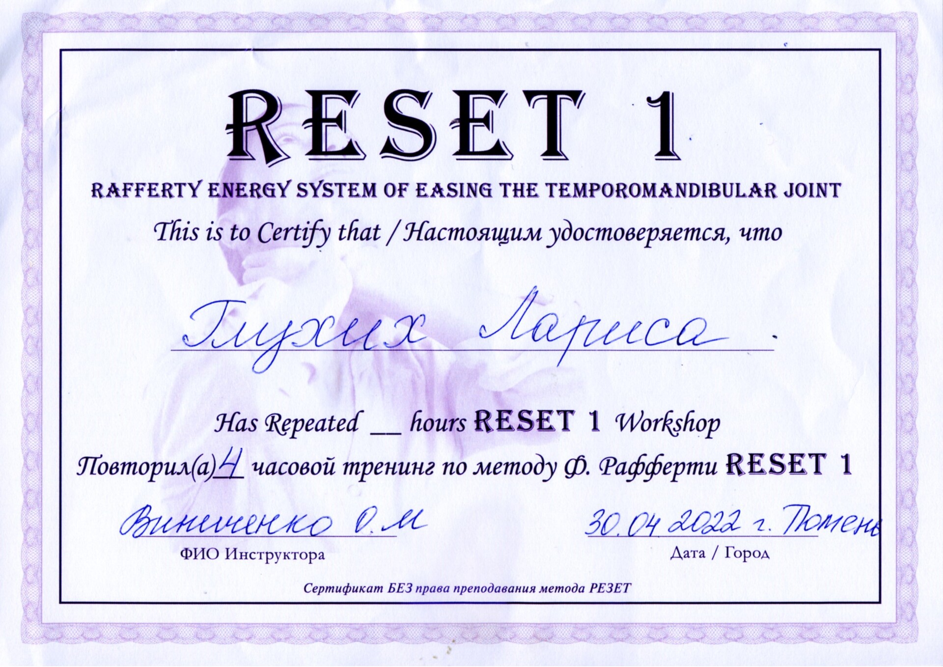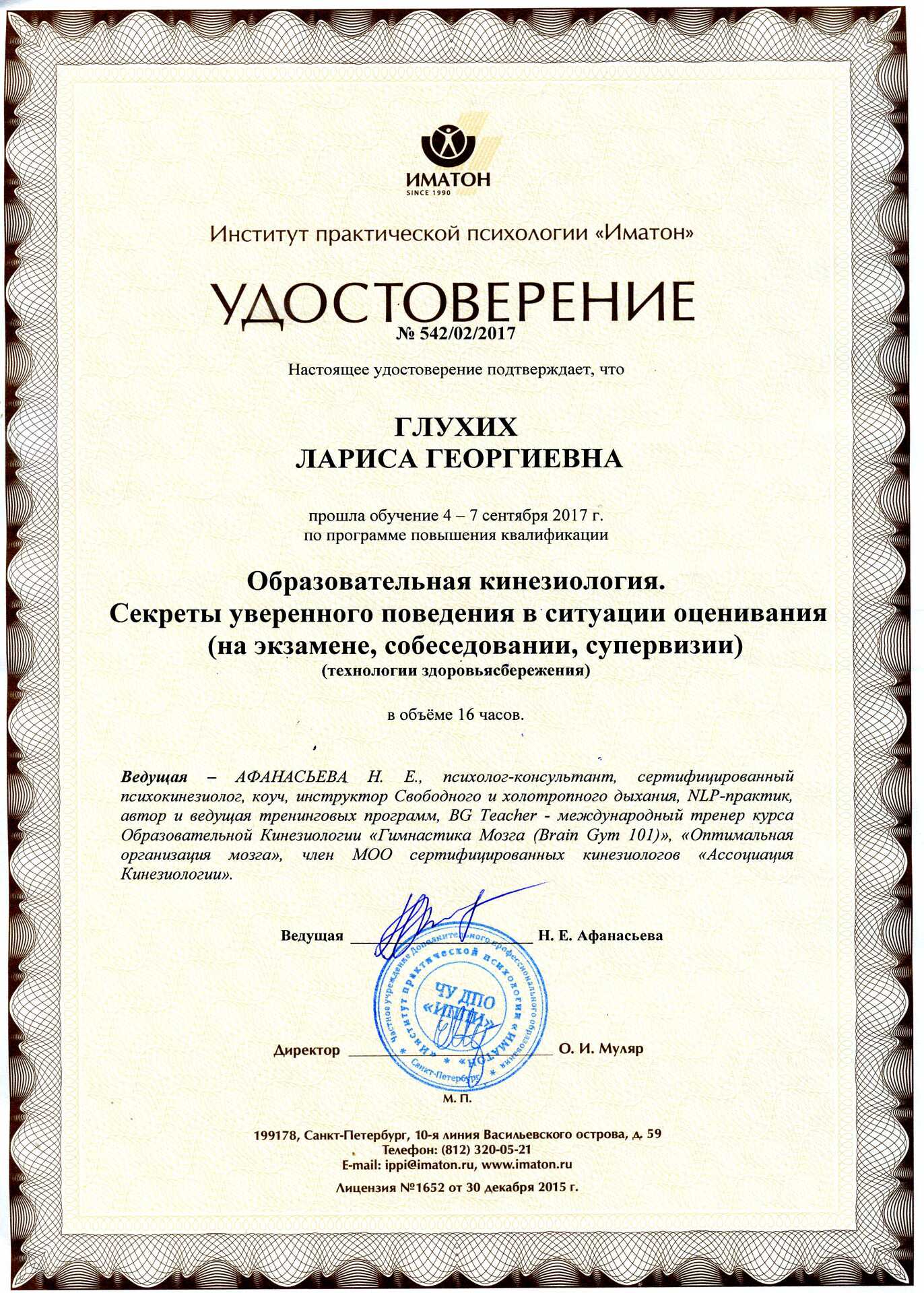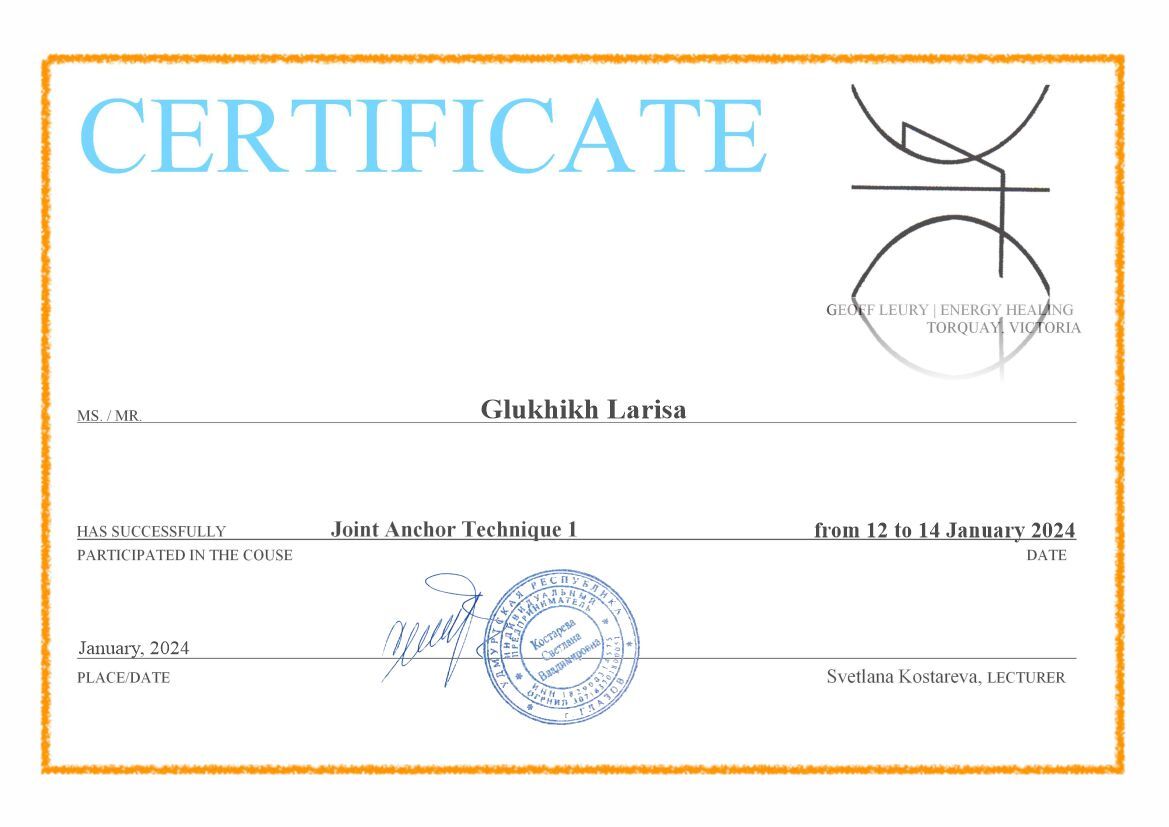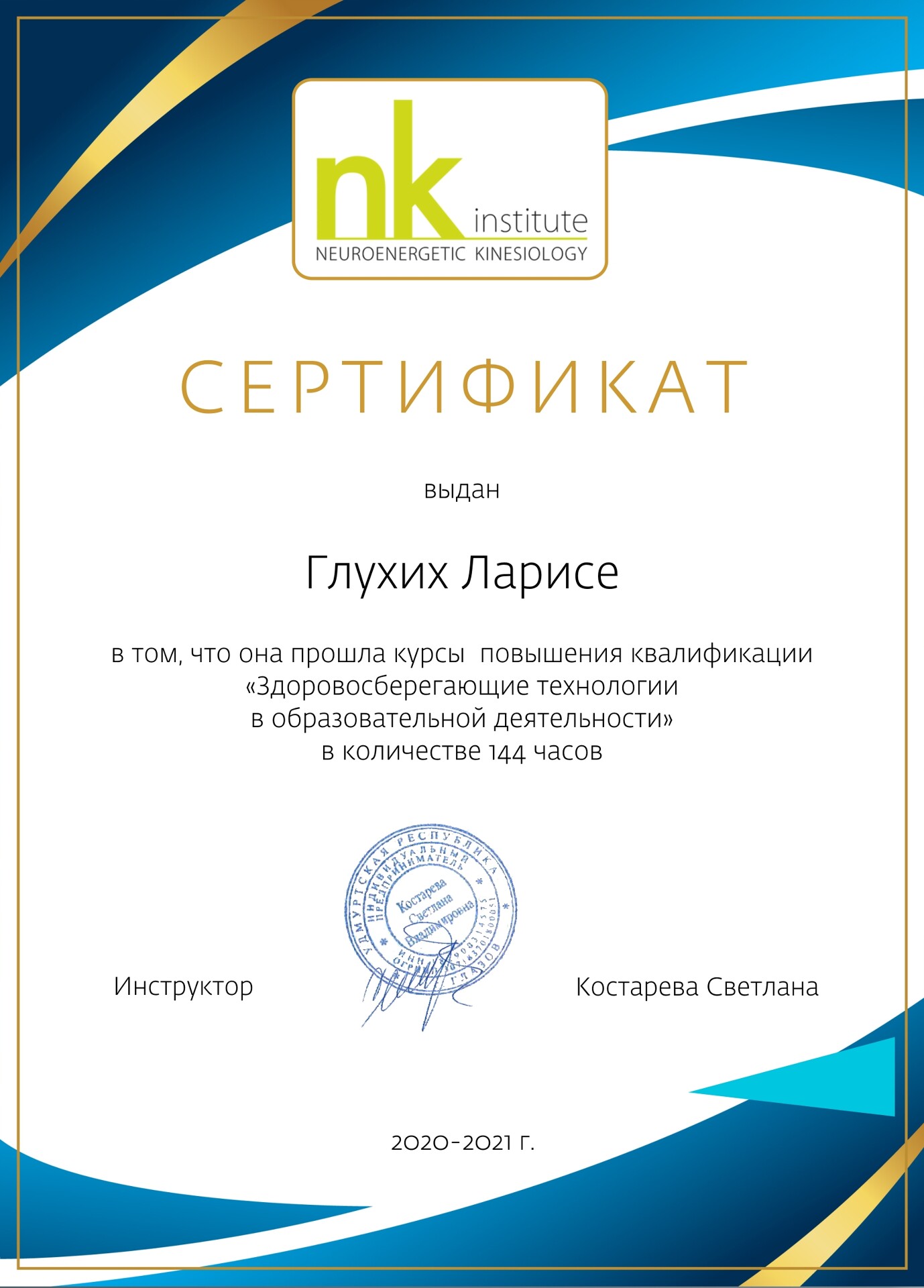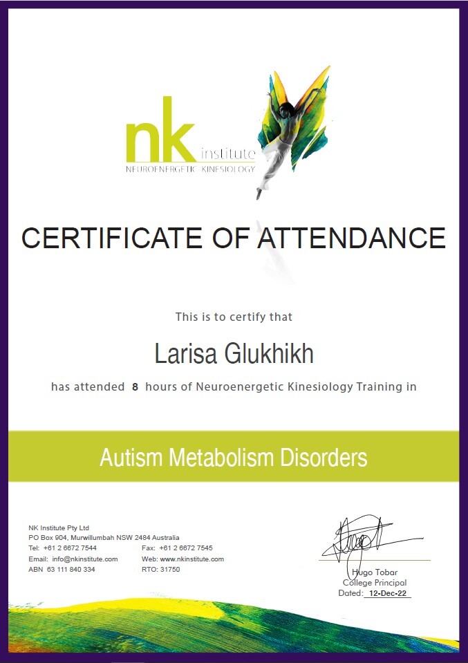 Международный сертифицированный инструктор: Целебного прикосновения 1-4, Гимнастики мозга 101, Гимнастики мозга 104, Резет-1,2, Баланса Энергии, Кругов зрения, Принципы кинезиологии 1-4, Форматирования мозга, Форматирования физиологии, NEPS-1, NEPS-2, NEPS-3, NEPS-4, Голограммы основных чакр, Голограмма чакр 4, Голограмма малых чакр, Голограммы Небесных чакр, Метафоры чакр, Баланс 5 элементов, Техника суставного якоря -1, Техника суставного якоря -2, Автор НейроОбразовательной кинезиологии.