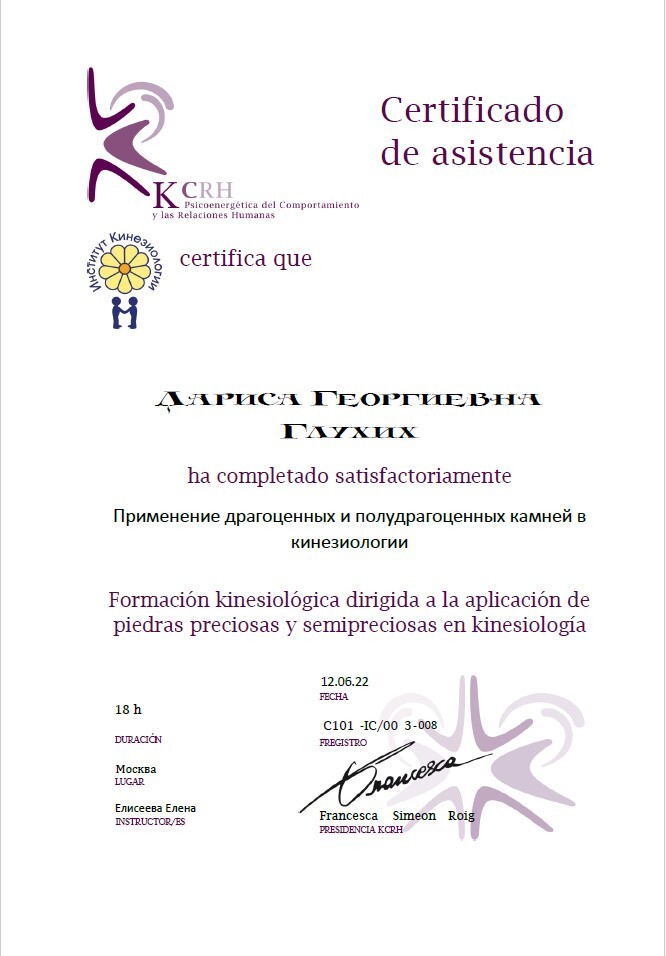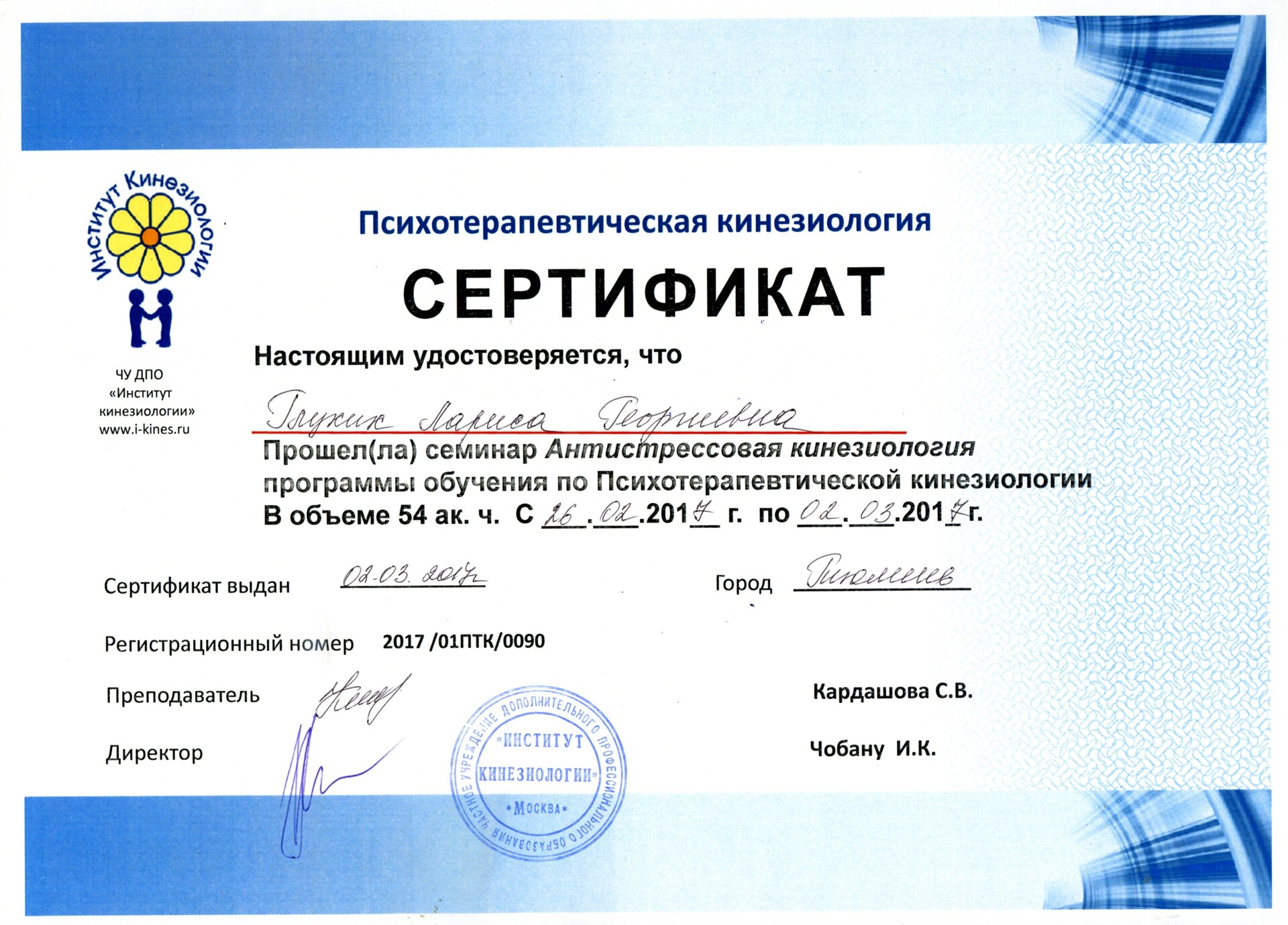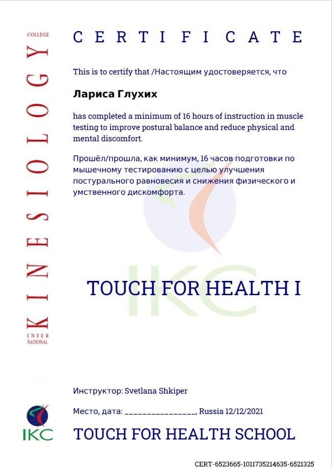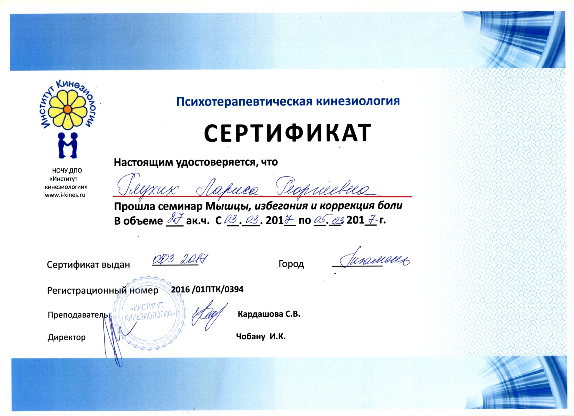 По окончании курса, выдается сертификат ИНСТИТУТА КИНЕЗИОЛОГИИ И ПСИХОЛОГИИ