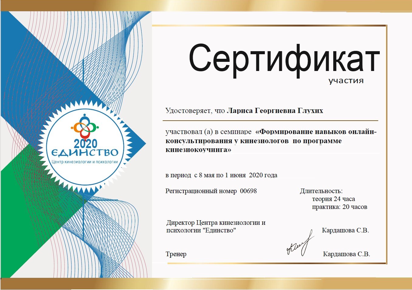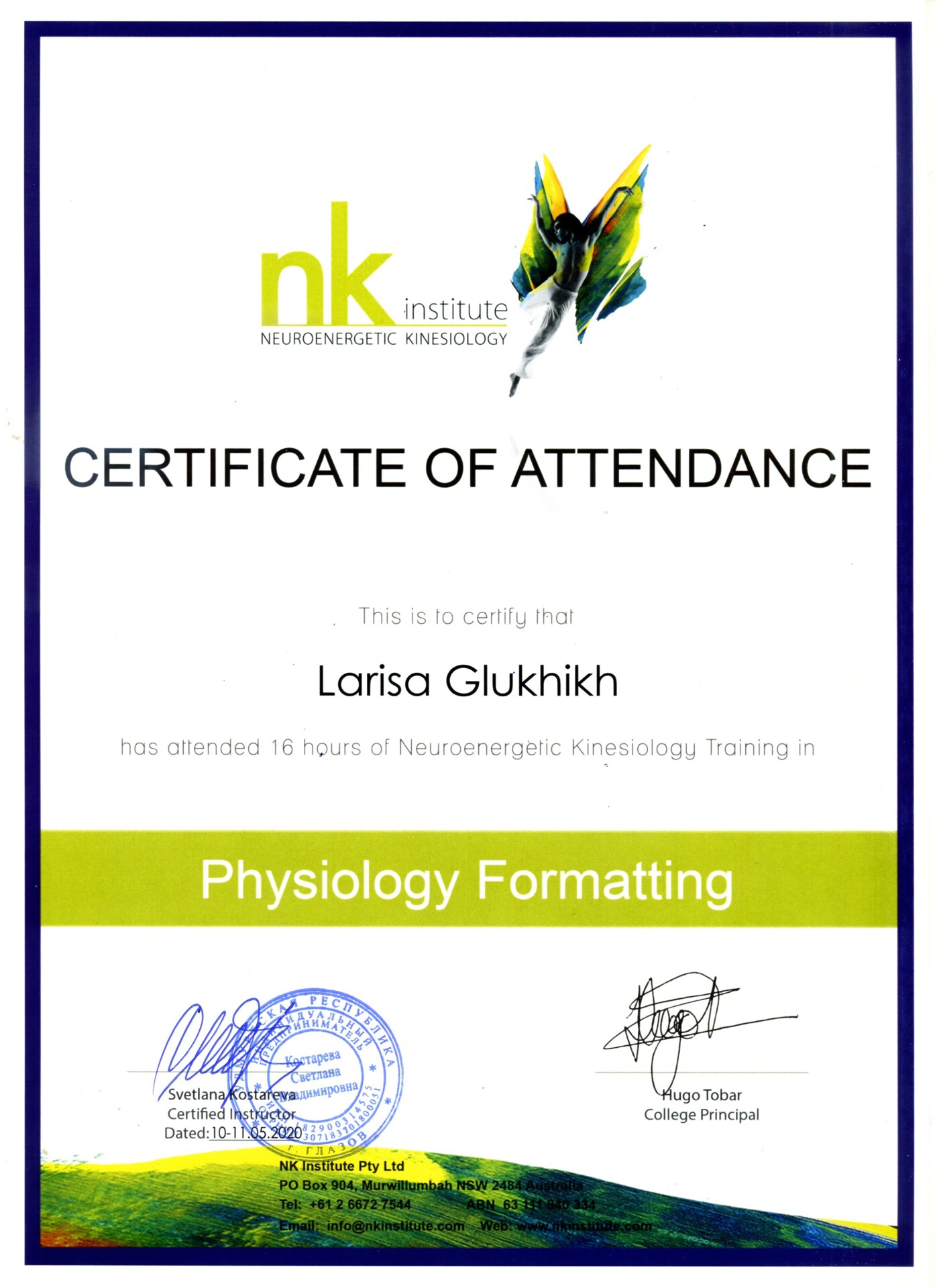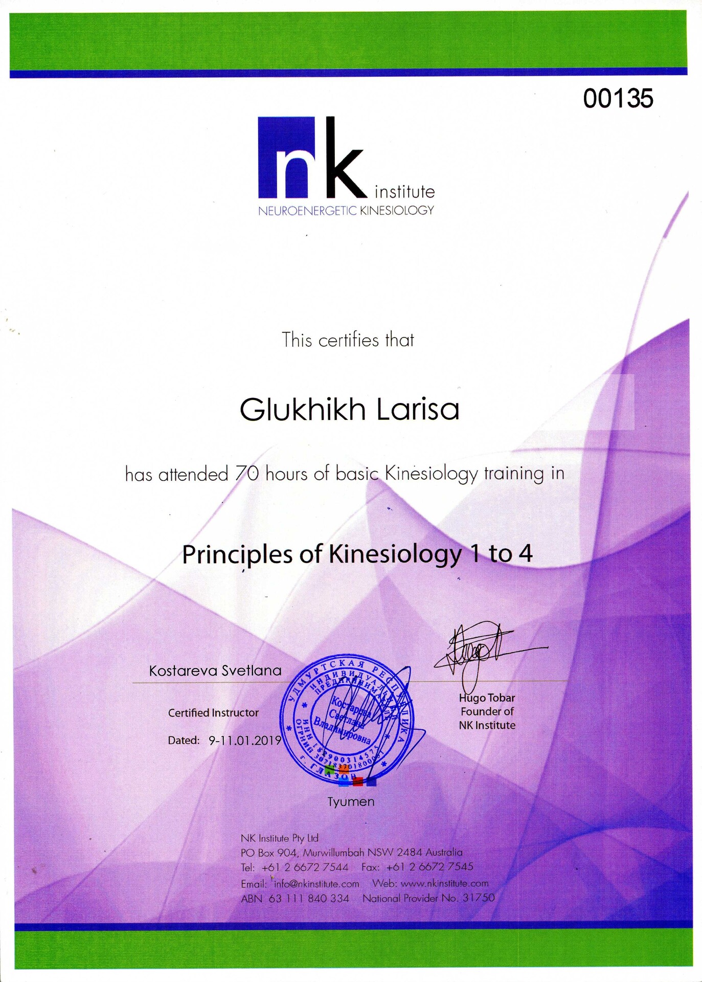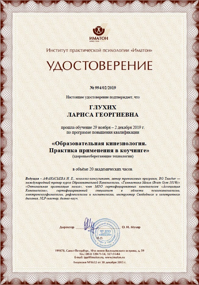 По окончании курса, выдается сертификат ИНСТИТУТА КИНЕЗИОЛОГИИ И ПСИХОЛОГИИ