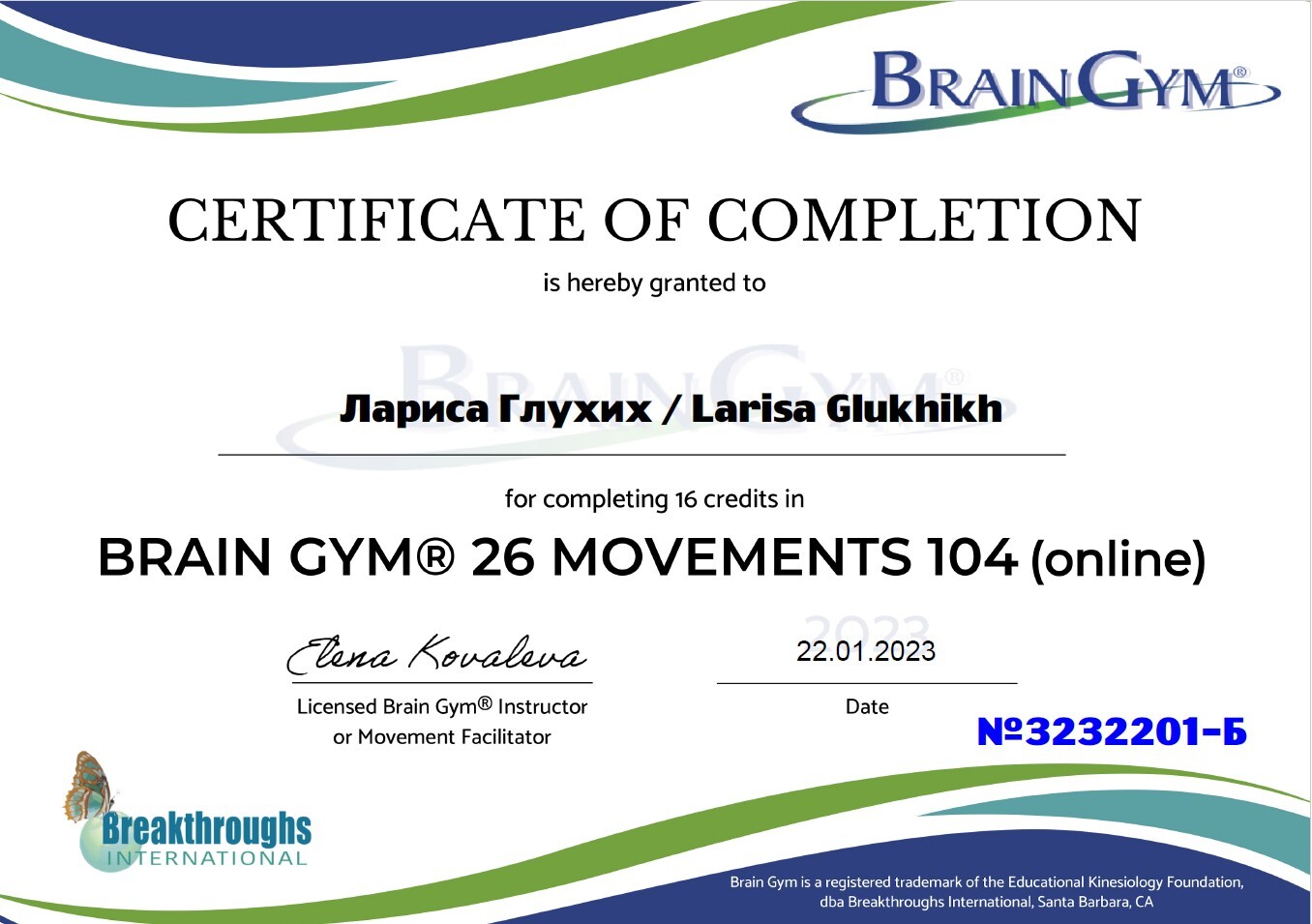 Лицензированный Фасилитатор Упражнений Гимнастики Мозга®, преподаватель Brain Gym® 104.